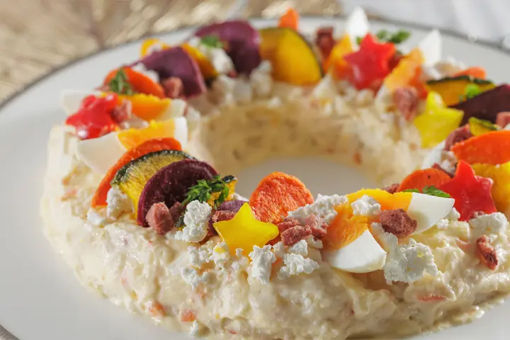 なめらかなポテトサラダに、コンビーフの旨みと半熟卵のまろやかさを重ねた、クリスマス限定のメニュー。クリスマスリースをイメージし、星形にかたどった野菜などを飾り付けて、華やかに仕上げました。