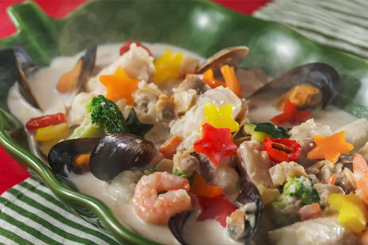 ぷりぷりのアンコウや貝類をたっぷり使い、まろやかで深みのあるクラムチャウダー風スープに。心までぽかぽかと温まる味わいです。クリスマス期間は、星形の野菜などを乗せ華やかな装いに。