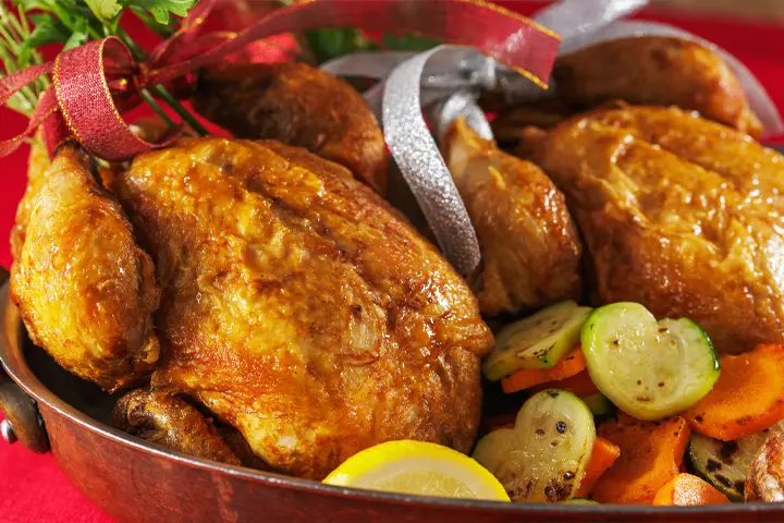皮は香ばしくパリッと、中はジューシーに焼き上げたローストチキン。香草の香りと肉の旨みが広がる、クリスマス限定の特別メニューです。丁寧な火入れが生む、奥深い味わいをご堪能ください。
