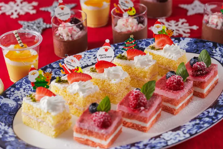雪が降り積もったようなショートケーキに、甘酸っぱい苺とサンタの可愛らしい飾りを添えて。ダークチェリー香る濃厚チョコムースなど、多彩な甘味でクリスマスを華やかに締めくくってください。