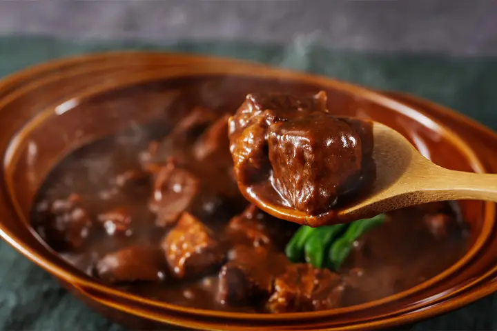 じっくり煮込んだ牛肉は、ほろりとほどける柔らかさ。赤ワインとデミグラスの深いコクが溶け合ったソースとともに、心も温まるクラシックな王道の洋食メニューです。
