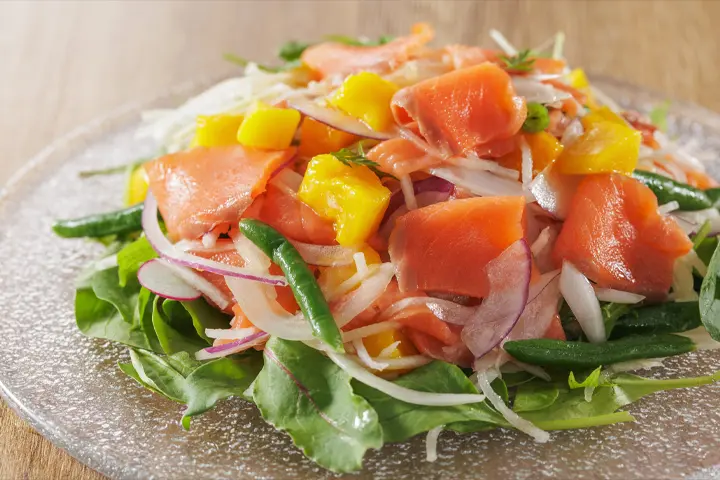 芳醇なスモークサーモンに、ゴロッと入った甘酸っぱいマンゴーの果肉を合わせたトロピカルマリネ。旬のサーモンと常夏の果実が織りなす、さっぱり爽やかな一皿です。