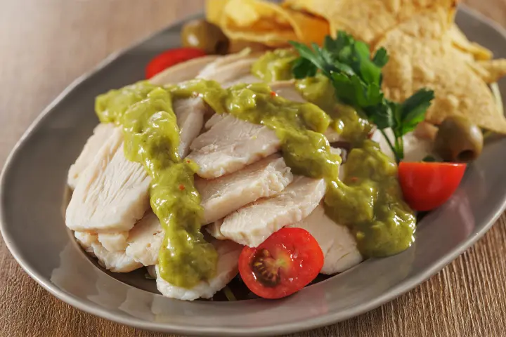 しっとりと仕上げた鶏むね肉に、濃厚でクリーミーなアボカドソースをたっぷりと乗せてお楽しみください。香ばしいナチョスが食感のアクセントに。