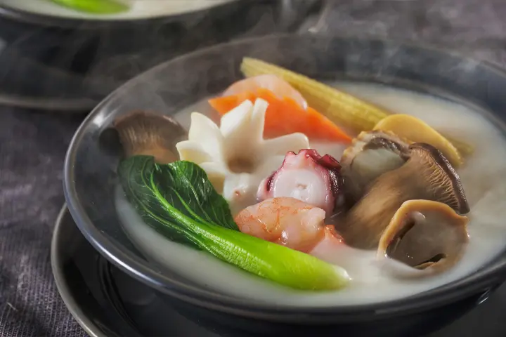 いわき産のエリンギと魚介を、ココナッツミルクでまろやかに煮込んだ一皿。魚介の旨みと南国の風味がふわりと広がるエキゾチックな味わいです。
