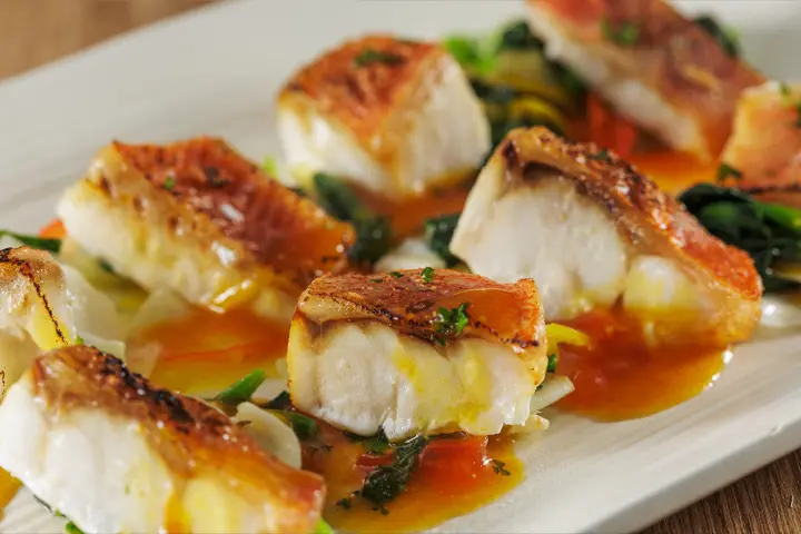 皮目をパリッと焼いたメヌケに、サフランがほのかに香る、まろやかな酸味のソースを添えた逸品。繊細な香りをまとったやわらかな身は、口に運ぶたびに余韻を残す上品な味わいです。