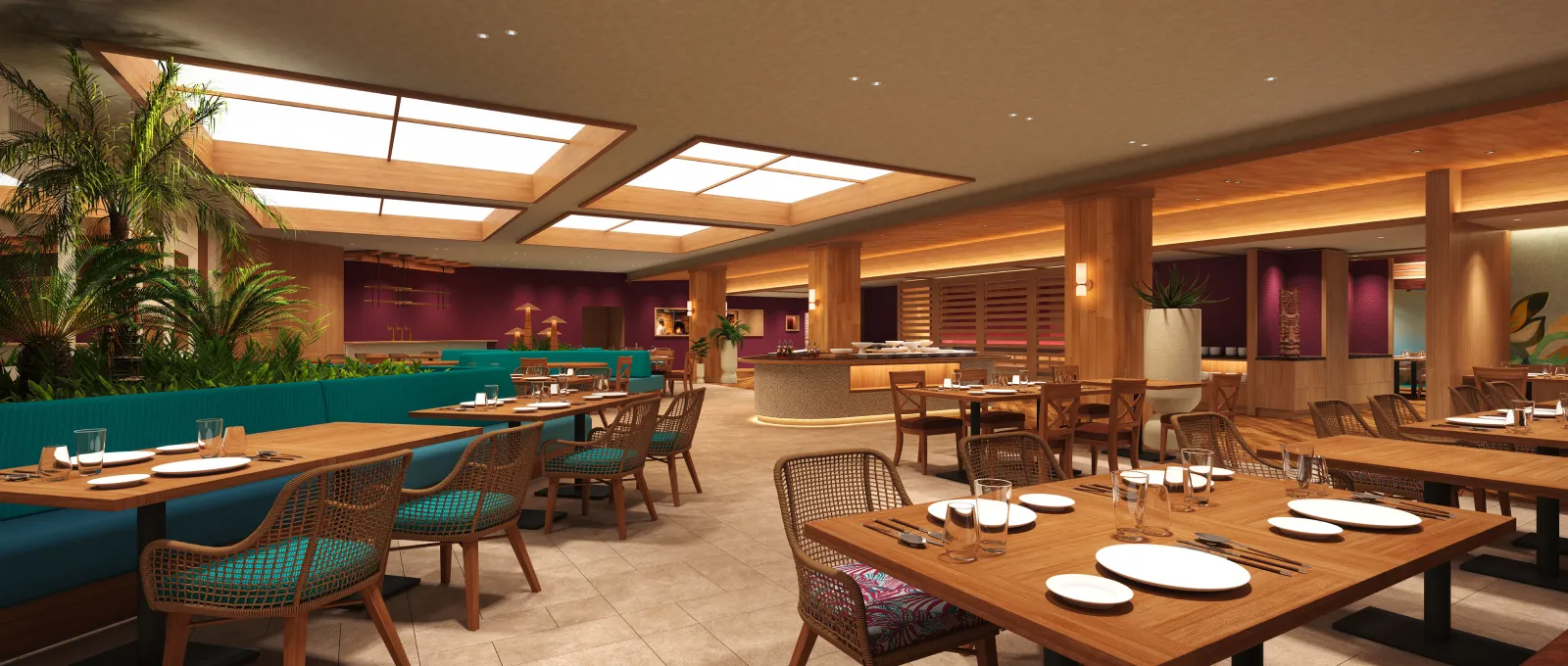 2028.Spring OPEN Guests will be greeted by unique tiki and mascot character banners. New welcome decorations will be installed to enhance the impression that you have arrived at Hawaiians!