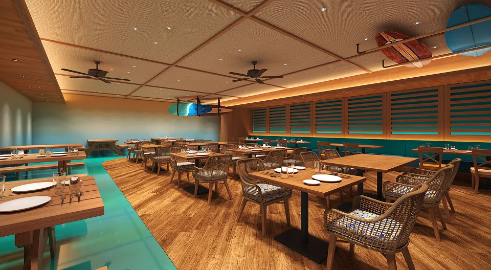 2028.Spring OPEN Let's have fun! Upon arrival, you'll be greeted by the sounds of waves, heart-warming music, and dancing, along with the echoes of ALOHA. The interior features aged wood that evokes driftwood from the sea, a thatched roof, and flooring that resembles sand, creating a new day-trip entrance.