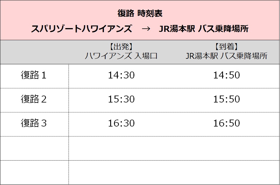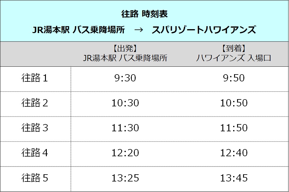 JR Yumoto Station bus stop ⇔ Spa Resort Hawaiians Water Park entrance