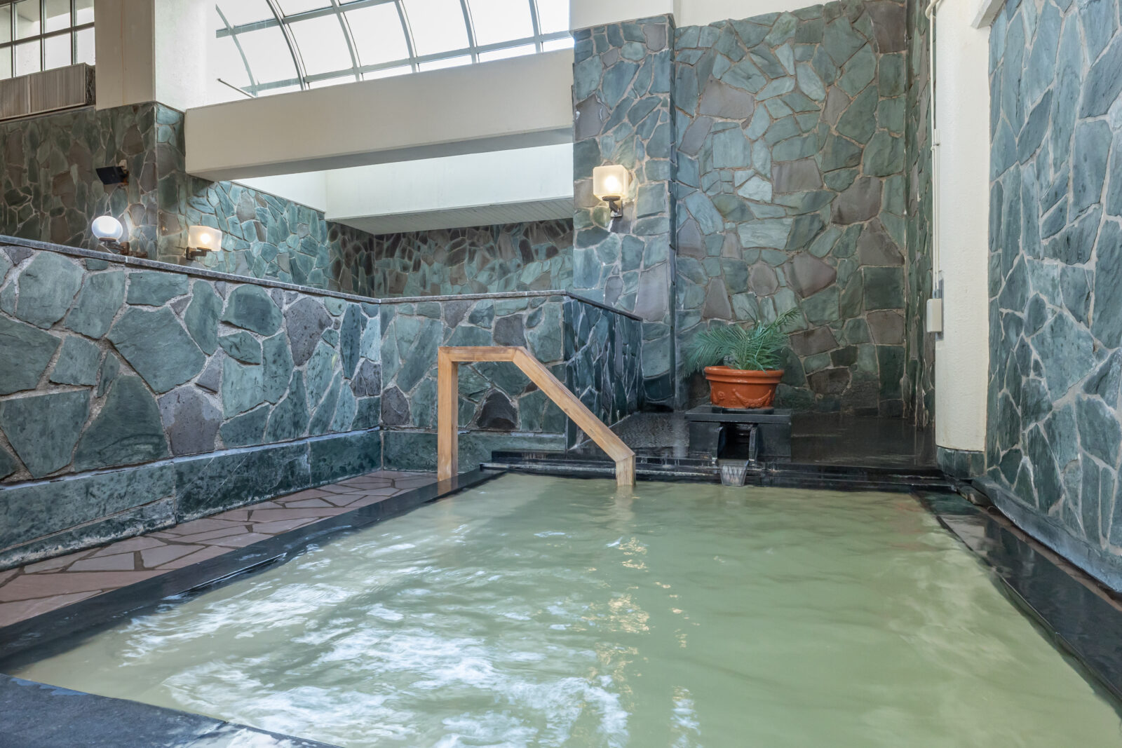 This Southern European-style indoor spa is perfect for wearing a swimsuit and offers a wide variety of bathtubs.