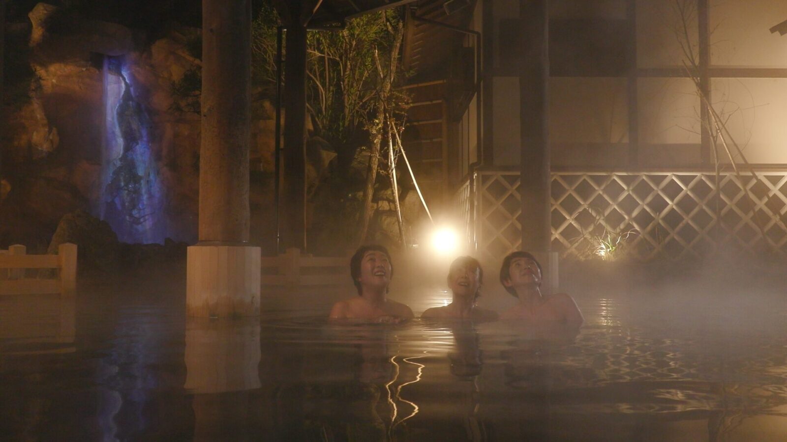 The open-air bath has three entrances and is equipped with a stone bathtub filled with hot water.