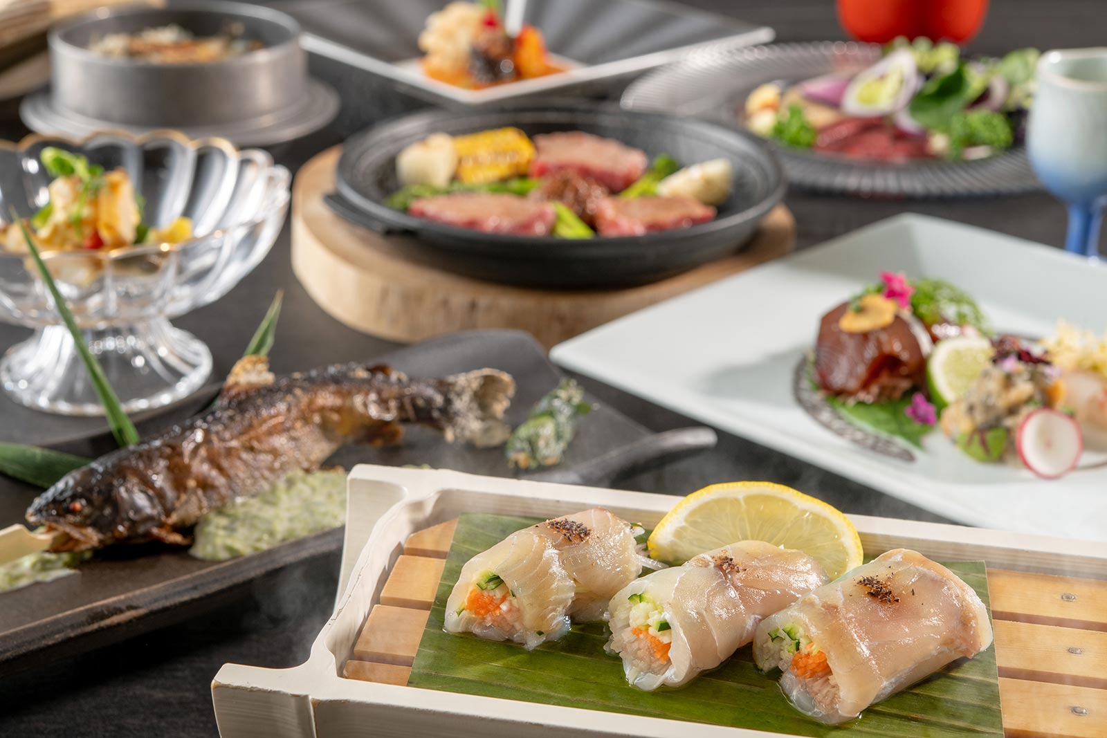 Enjoy the bounty of summer nurtured by the sea breeze of Joban and the mountains of Fukushima with the "Shunsai Fukushima Kaiseki" course, engaging all five senses. Local ingredients such as fresh fish from the Joban coast and Fukushima beef are transformed into surprising and exquisite Japanese dishes by skilled Japanese chefs who employ delicate techniques and creative ingenuity. Savor a special culinary experience that will enhance your evening, including fragrant char and mehikari rice cooked in a pot.
