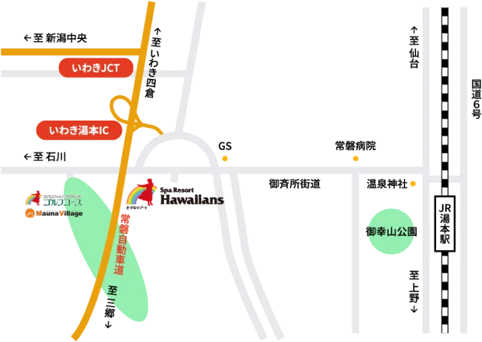 ハワイアンズ(ホテル玄関前)→ 湯本方面 → 内郷