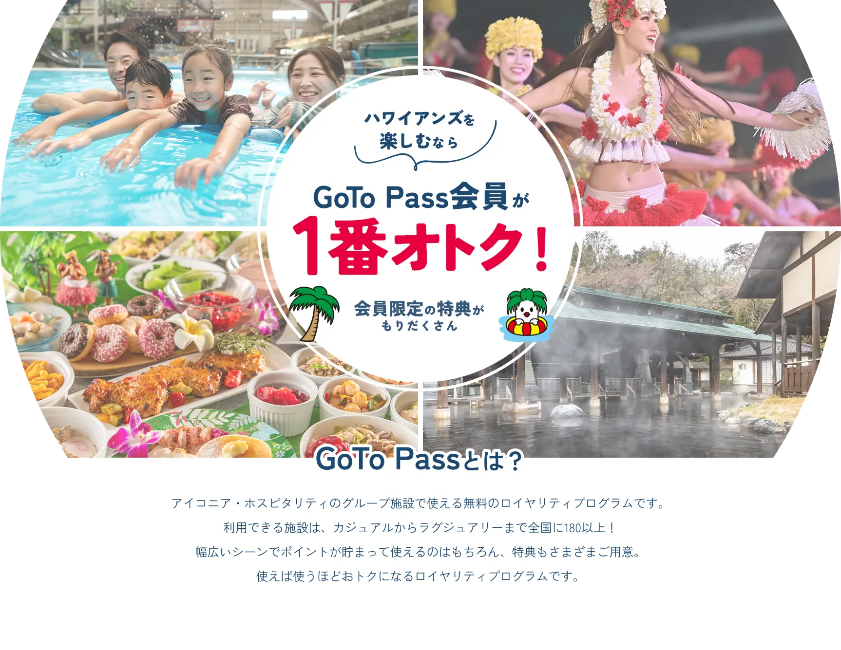 アイコニア・ホスピタリティのグループ施設で使える無料のロイヤリティプログラムです。利用できる施設は、カジュアルからラグジュアリーまで全国に180以上!幅広いシーンでポイントが貯まって使えるのはもちろん、特典もさまざまご用意。使えば使うほどおトクになるロイヤリティプログラムです。