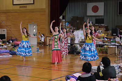 2011年3月11日に東日本大震災が発生。「スパリゾートハワイアンズ」は休館を余儀なくされ、フラガールたちは踊る場所を失ってしまいました。それでも原発事故の風評被害にあえぐ故郷いわき、福島、そして東北全体の復興のため少しでも役に立ちたい、福島・いわきの笑顔と元気を届けたいと、「フラガール全国きずなキャラバン」をスタートし、同年5月から10月までの間に、全国26都府県と韓国・ソウルを含む125か所で247回の公演を行いました。