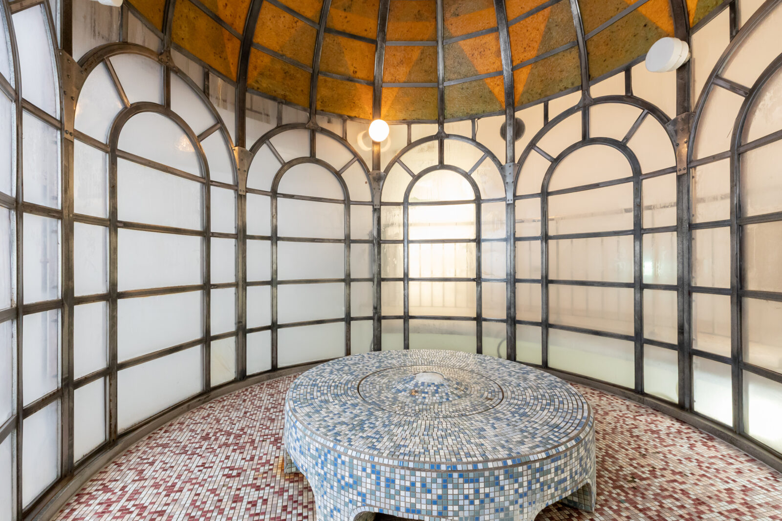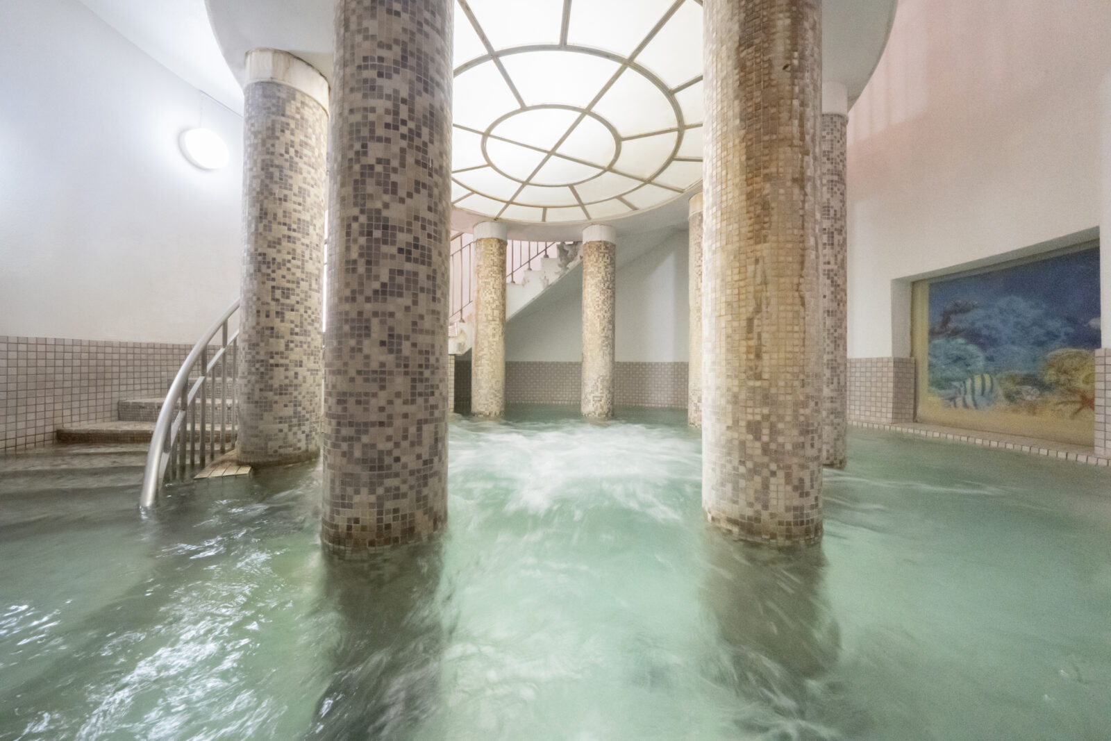 アートタイルで縁取られたプールと、シンプルな円形プールの2つからなる室内温泉浴槽。
