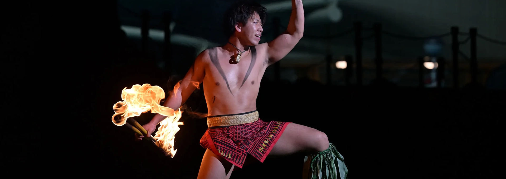 ファイヤーナイフダンスは、南太平洋の島国サモアに古くから伝わる「戦いでの勝利のジェスチャー」をもとにした踊りです。大きなナイフの両端に燃えさかる火を点けて、体の周りでバトンのように自由自在に回しながら勇敢に踊ります。