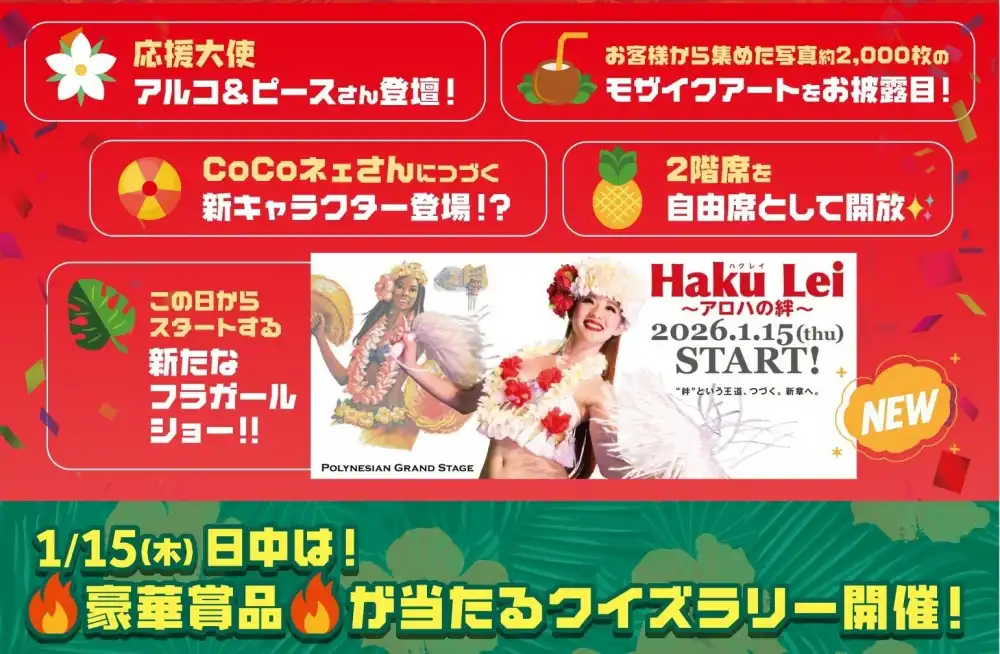 「ハワイアンズ還暦際」のフィナーレを飾るセレモニーや、60周年を記念して誕生する新・マスコットキャラクターのお披露目式を行ないます。