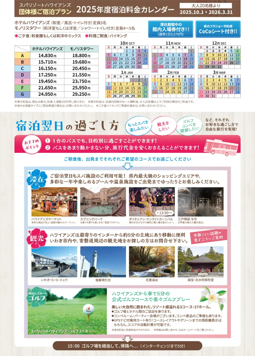 ※表示料金は、ホテルハワイアンズ(和室タイプ/定員5名 お風呂付き・トイレ付き)をご利用の場合の料金です。